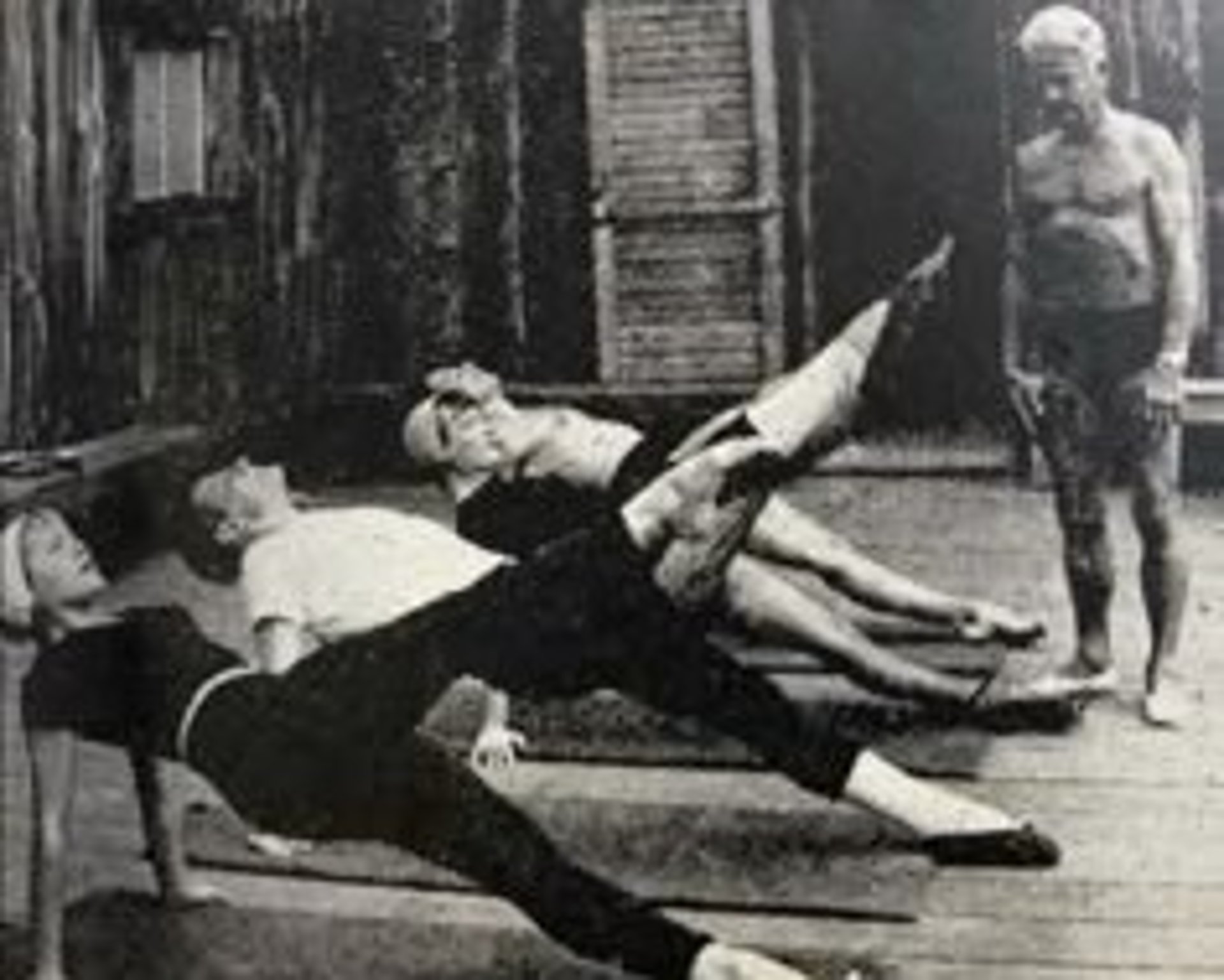 Betrachte die Frauen auf dem Foto und wie Joe Pilates schaut. Die Frau im weißen Shirt hängt durch, der Kopf nach hinten geworfen, Schultern an den Ohren, der Fuß schief und außerhalb der Matte... Joe Pilates is not amused :-).
